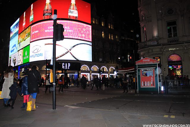 Essa é a prima londrina da Times Square de Nova York. Ela se localiza no cruzamento de quatro ruas e por lá você irá encontrar muitas lojas, painéis publicitários bem iluminados e muitos turistas. É uma visita imperdível, na minha opinião. Bem perto dali está a Chinatown, quem também é um lugar gratuito e bem legal de se conhecer.