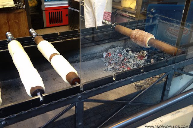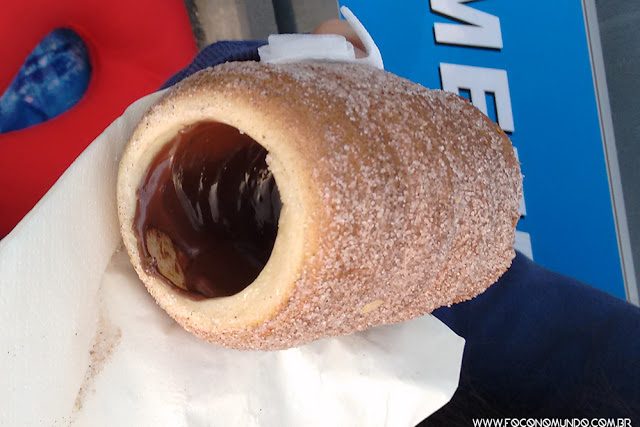 Trdelník, uma comida típica de Praga, deliciosa! É uma espécie de pão assado nesses espetos como na foto acima, depois passado na canela e açúcar e se você quiser pode ser recheado.