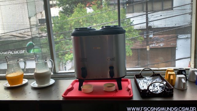 O café da manhã é gratuito, bem simples e muito gostoso. Para beber tinha café, suco, leite e achocolatado. Para comer tinha torrada, pão, bolo, biscoito, frios, geleia e frutas. Além disso, há uma torradeira e uma sanduicheira.
