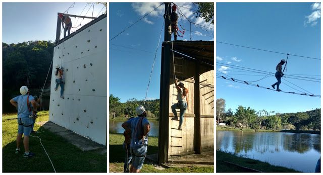 Começamos pela parede de escalada, que parece fácil mas foi a parte mais complicada para mim. Eu quase consegui chegar lá em cima, mas acabei desistindo porque minhas forças acabaram. Como não conseguimos, subimos por uma escadinha que fica atrás da parede, para chegar na ponte de cordas.
